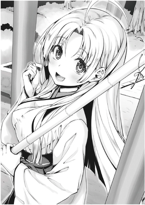 Assim como as outras mulheres, a Akeno-san tocou a estátua de pedra. É apenas uma coisa pequena, mas a estátua da sacerdotisa se parecia muito com ela…. Enquanto eu pensava sobre isso, ela falou comigo com um largo sorriso.